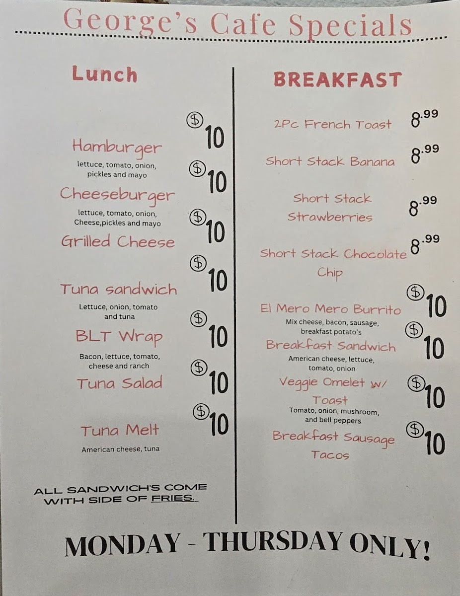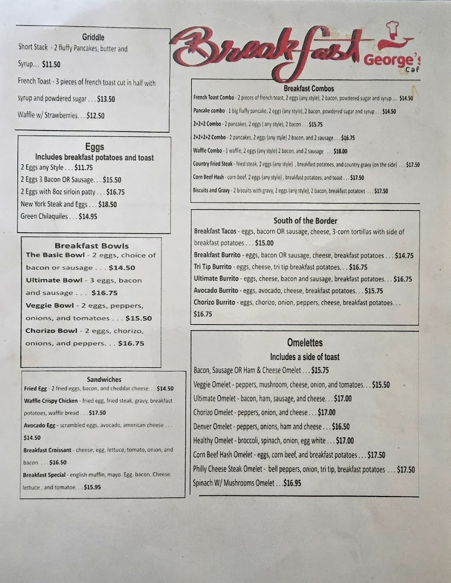 Breakfast Combos include classic morning dishes such as French toast, pancakes, waffles, eggs cooked to order, bacon, and sausage. These combos offer a balanced meal, combining sweet and savory elements ideal for a morning or brunch setting.